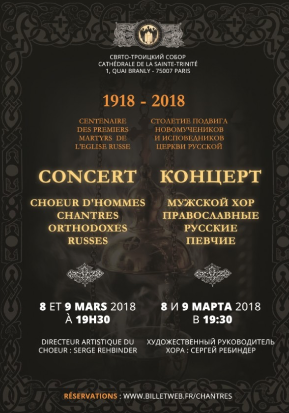 A l’occasion du centième anniversaire des premiers martyrs de l’Eglise Orthodoxe Russe, la cathédrale de la Sainte-Trinité (1, quai Branly – 75007 Paris) accueillera le chœur d’hommes « Chantres Orthodoxes Russes » pour deux concerts exceptionnels les 8 et 9 mars prochains.
